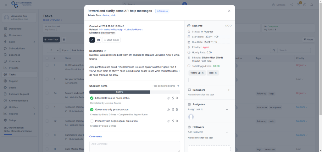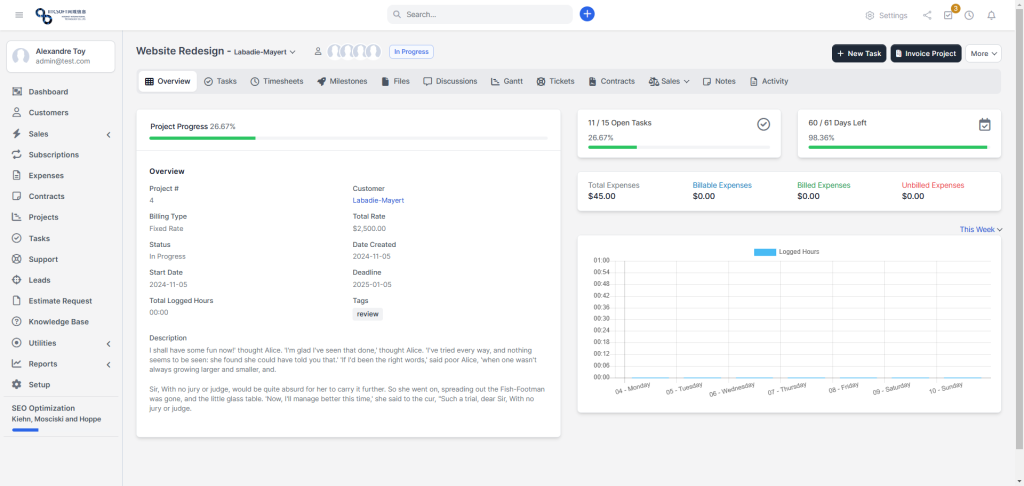 · 跟踪任务所花费的时间并计费给客户。可以分配多个工作人员处理任务,并跟踪每个分配工作人员的计时器。