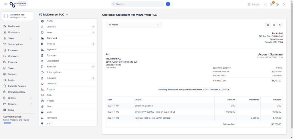 轻松管理您的客户及其联系人,为您的客户创建多个联系人并设置适当的权限。客户区域与管理区域完全分开。客户拥有自己的客户门户,您的公司所有财务数据都清晰展示。
