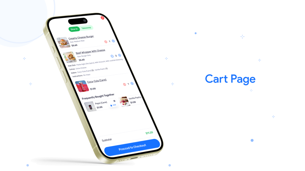 购物车管理:显示已选菜品及变体,支持附加选项配置。