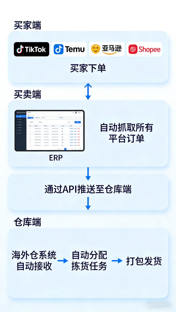 ERP根据卖家预设的规则(比如这个货在XX海外仓),自动把发货指令推送到海外仓系统。